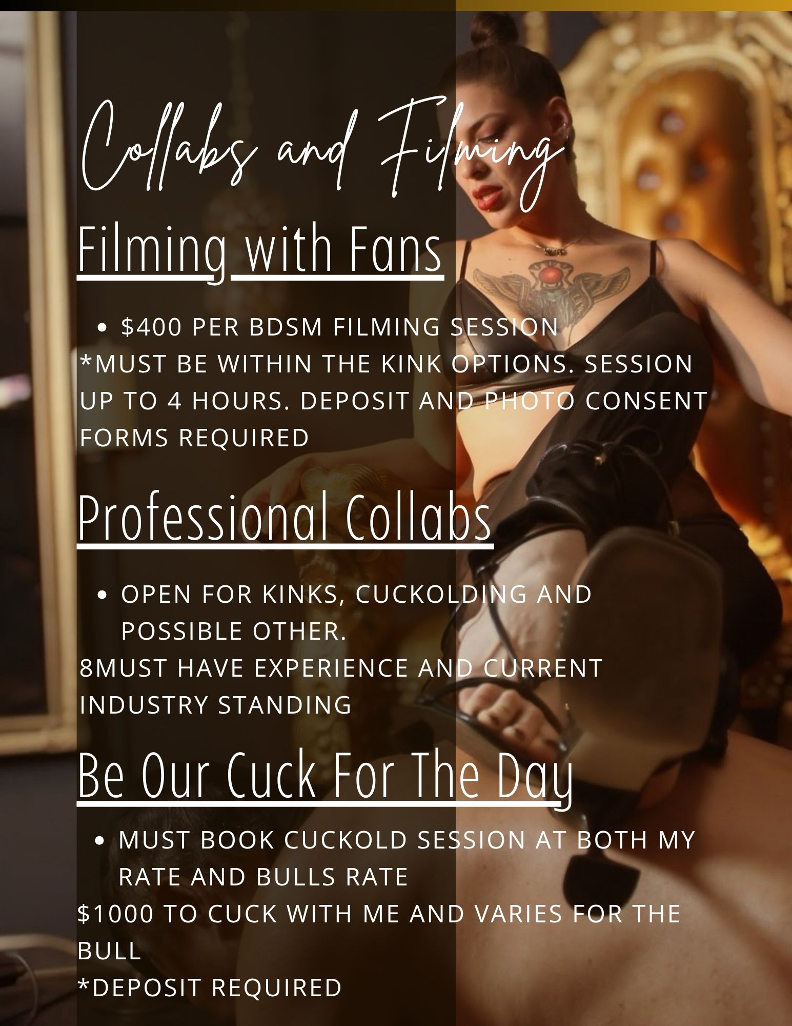 For over seven years, I’ve refined My craft through immersive sessions, relentless practice, and private mentorship under elite figures in the BDSM community. I host select sessions and events in high-end dungeons across Los Angeles and Orange County, crafting personalized experiences for those worthy of My time.